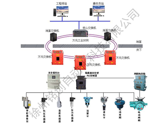礦用排水監(jiān)控系統(tǒng)采用可編程控制器(PLC)進行控制,通過圖形、圖像、曲線、數(shù)據(jù)、文字等方式,實時準(zhǔn)確地反映系統(tǒng)工作狀態(tài)以及水倉水位、電機工作電流、電機溫度、軸承溫度、排水管流量、水泵狀態(tài)等參數(shù)。根據(jù)水倉的實時參數(shù)控制水泵輪流工作與適時啟動備用水泵,實現(xiàn)水泵按照水艙水位的高低和供電線路載荷情況自動啟停、自動輪詢、避峰填谷。同時,系統(tǒng)通過傳輸設(shè)備聯(lián)網(wǎng),可以實現(xiàn)多泵站無人值守,大大降低礦井泵站運行人工費用,節(jié)能減排,減員增效,有效提高礦井安全生產(chǎn)和自動化控制水平。